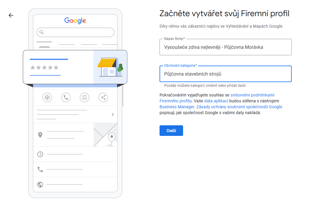 Do pole „Název firmy“ napište stejný název jako u hlavní pobočky, jen doplňte lokalitu, například: „Vysoušeče zdiva nejlevněji – Půjčovna Morávka“. Do pole „Obchodní kategorie“ zadejte to samé, jako u předchozího profilu.