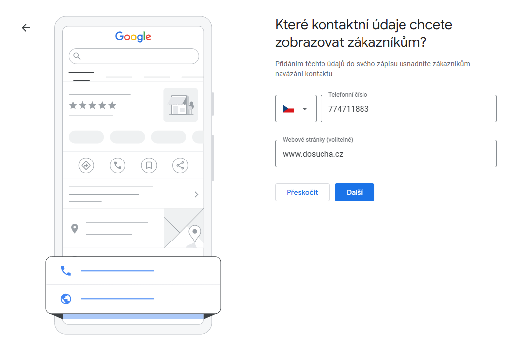V této části zadejte telefonní číslo a webové stránky. Pro správné propojení profilů je nutné použít stejné údaje jako u původní pobočky v Ostravě – tedy stejný web a stejné telefonní číslo.