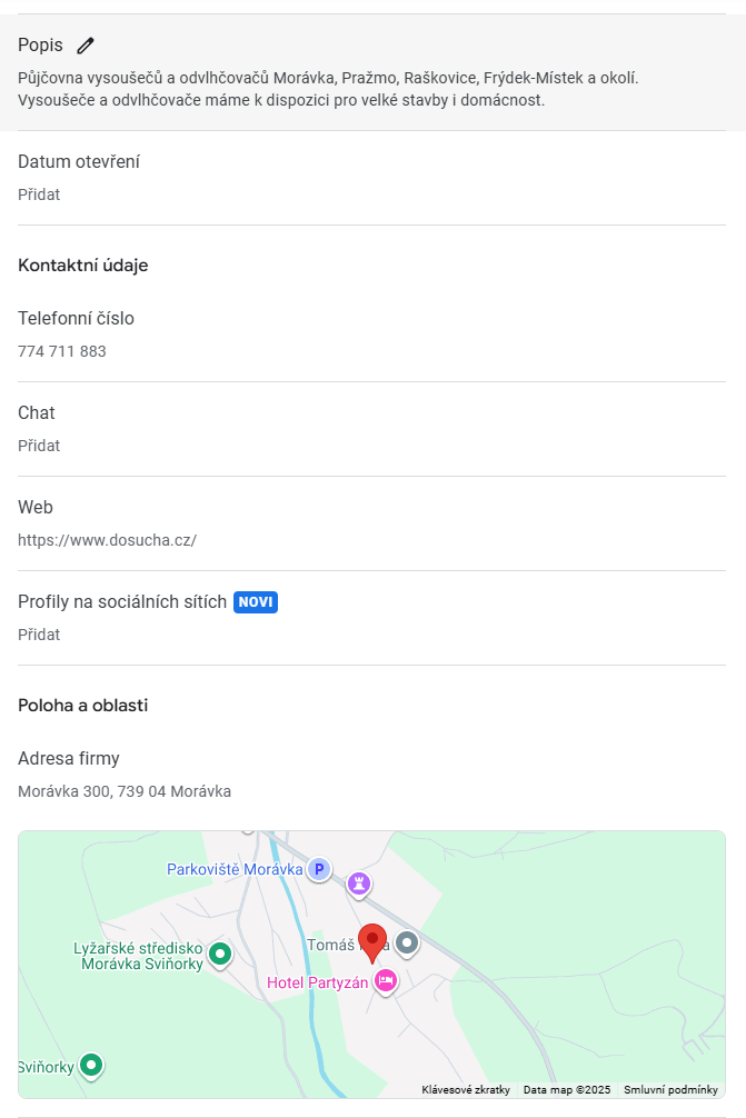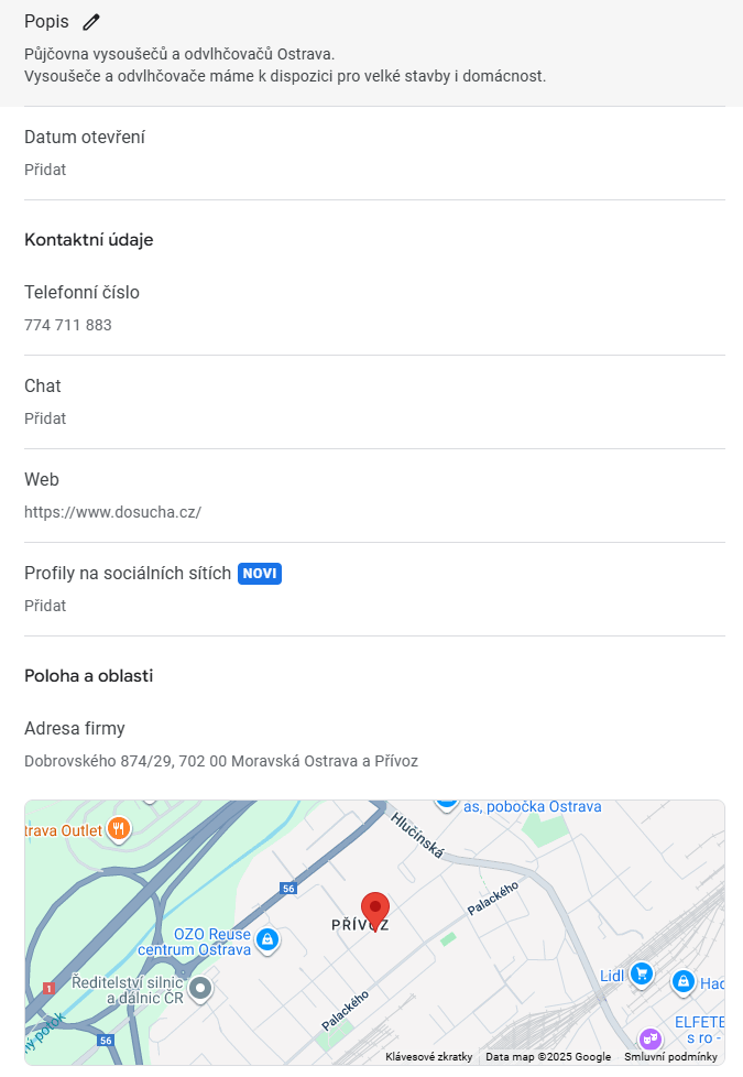 Mnoho firem, které už mají ověřený profil v Mapách Google, dříve či později řeší stejnou otázku: „Máme druhou pobočku, sklad nebo výdejní místo — jak ji dostaneme na mapu, když už máme jeden profil? Přesně to byl i případ půjčovny Vysoušeče zdiva nejlevněji – Půjčovna Ostrava, která poskytuje vysoušeče a odvlhčovače pro stavby i domácnosti. Firma chtěla přidat druhou provozovnu na Morávce (okres Frýdek-Místek), kde zákazníci mohou zařízení osobně vyzvednout.